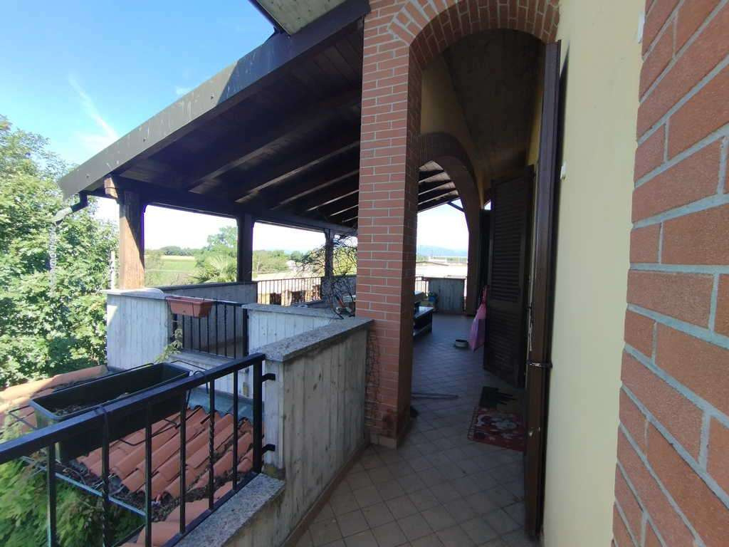 Intera piena proprietà di appartamento di mq. 222 posto al piano primo di edificio di due piani fuori terra posto in zona agricola, con cantina posta al piano seminterrato. L’appartamento è composto da scala esterna con accesso al balcone perimetrale, soggiorno, cucina abitabile, bagno, lavanderia, camera con bagno, altra camera con scala di accesso al sottotetto. All’esterno vi è un lastrico, costituente la copertura del portico al piano terra, coperto mediante estensione del tetto dell’edificio.L’esperto stimatore segnala a pagina 8 e seguenti della perizia che la scala di accesso al sottotetto, l’apertura nel solaio, l’utilizzo del sottotetto, la copertura del terrazzo sono realizzati in difformità agli atti autorizzativi; inoltre vi sono difformità interne relative ad arredi fissi e lucernari.Per tale motivo non dichiara la conformità urbanistica e edilizia, e dichiara la conformità catastale.
